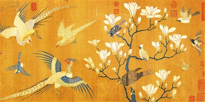 在元代织锦《百鸟朝凤图卷》前,众多参观者流连忘返。这件织锦是用多色丝线、金线和孔雀羽线织造而成,配色华丽,织造技术高超,是元代织锦的代表作。图像以凤鸟为主体,其他鸟类、花卉呈散点式分布,花鸟造型生动美丽。百鸟朝凤源于中国古代传说故事,凤鸟本是一只普通的鸟,用自己采摘积攒的果实拯救了濒临饿死的其他鸟类。这些鸟为报恩,各献出一根最美的羽毛给凤鸟,于是凤鸟成为最漂亮的鸟中之首。这个故事体现了和谐共生、团结互助的理念。