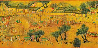 与《千字文》一样全部展开的还有长达12米的《姑苏繁华图卷》。这幅画作为清乾隆年间宫廷画家徐扬绘制。图卷上方也有一块电子屏,以动画形式展示了图中的重点场景。游船在河上来回穿梭,街巷间人头攒动,生动再现了清代苏州“商贾辐辏,百货骈阗”的繁华。