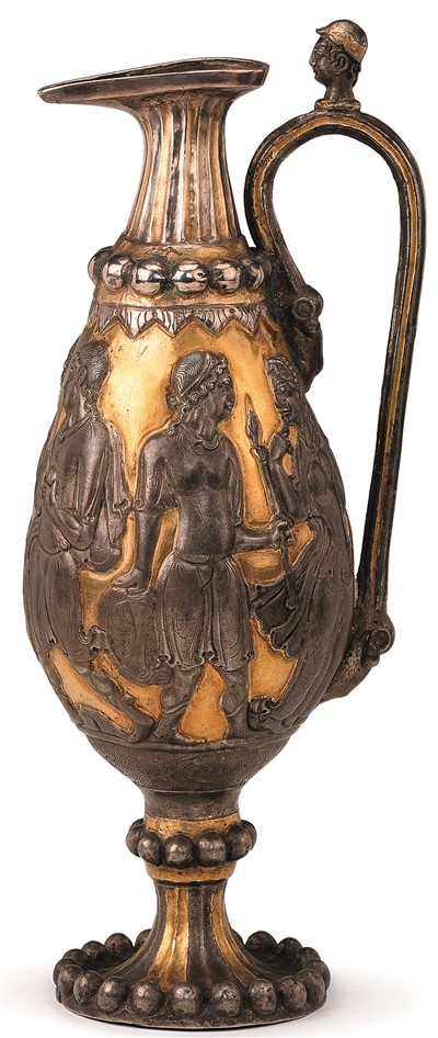 在“协和万邦”部分,东罗马鎏金银盘、北周鎏金人物故事纹银壶、唐代长沙窑青釉贴花舞蹈人物瓷壶等精美文物,诉说着中华文明与域外文明交流互鉴的故事。东罗马鎏金银盘为甘肃省靖远县北滩出土,银盘表面曾有鎏金,现已大部分脱落。盘内满饰浮雕花纹。纹饰分为3个区域:外圈饰16组相互勾连的葡萄卷草纹,其间栖有小鸟等动物;中间一圈浮雕呈环带状,内列12个人头像,每个头像左侧各有一只动物;盘中央为微微凸起的圆域,图案为一倚坐于猛兽背部的青年男性,猛兽圆足内底有点状铭文一行。学者认为,盘心图案中的男子是古希腊神话中的葡萄酒之神狄奥尼素斯,盘上所刻文字为大夏文。此银盘是中国境内发现的重要罗马文物,其制作年代大约相当于中国的魏晋南北朝时期。东罗马帝国前期与中国保持友好往来,据《魏书》记载,东罗马帝国曾3次派使团访问北魏。这只银盘也许是东罗马使者遗留在黄河古渡的贡品,也可能是西方商人带来贸易的物品。