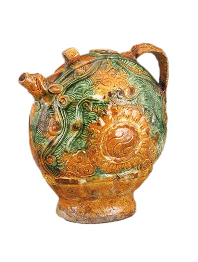 太极是中国古代哲学的一个重要概念,反映太极思想的太极图,是中国文化中常见的图案。辽代三彩釉印花太极图执壶造型巧妙、制作精细、装饰富丽,是辽代陶瓷中的佳作。壶为扁圆形,圆口,曲柄,管状短流,圈足。胎质灰白闪红,挂白粉。通体施黄、绿、白三色釉,水波纹地,上浮有如意流云带。柄外施绶带纹,流基部作牛首张口状。壶身两面印相同的凸起花纹,中心一朵莲花内饰有太极图式花纹,勾画出“始于天然、载于天道”的审美意境。
