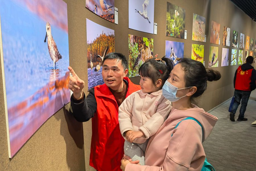 家长教孩子识别动物。福建省林业局供图