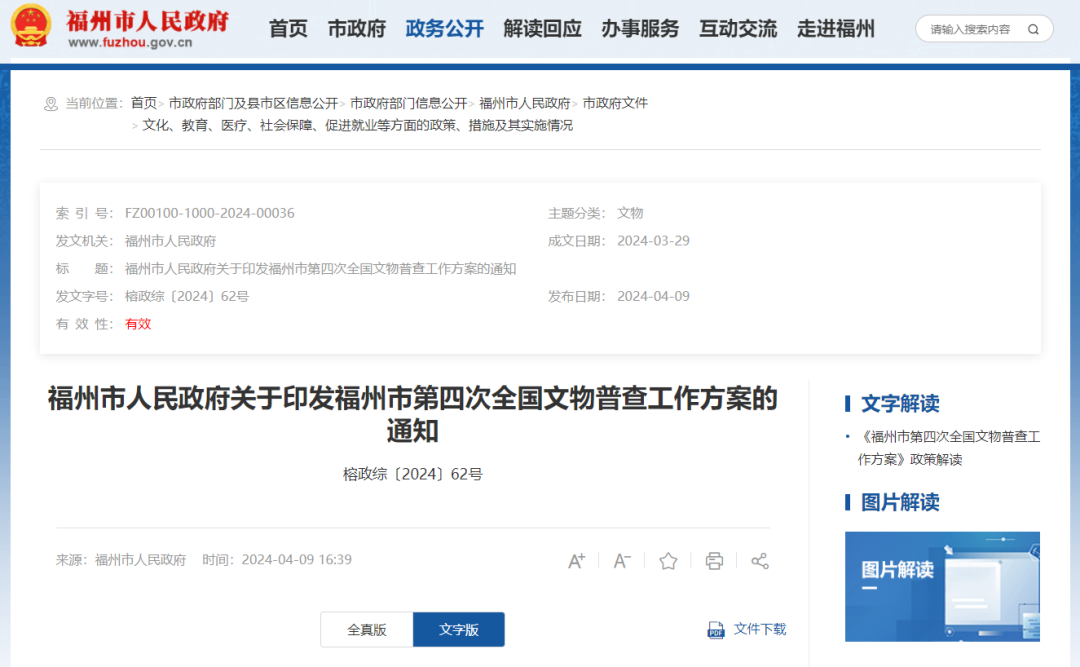 福州市人民政府关于印发 福州市第四次全国文物普查工作方案的通知 榕政综〔2024〕62号