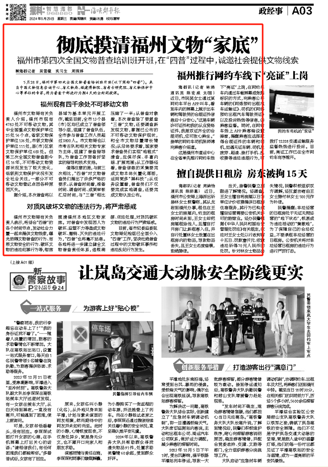 福州市文物局有关负责人表示,将结合“四普”的各个时间节点,发动社会力量一起来提供文物线索,曝光妨碍文物普查的行为、有损文物安全的行为、破坏文物的违法犯罪行为等,彻底摸清福州本地区文物家底。对普查中发现因人为破坏、监管不力等造成文物破坏、撤销、灭失的违法行为,“四普”也将毫不姑息。各地将进一步建立健全文物普查责任体系,追根溯源、依法处理,对顶风破坏文物的违法行为严肃惩戒。