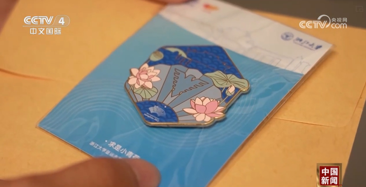 浙江大学学生伍宸亮:“这个徽章是浙江大学在去年的杭州亚运会、亚残运会期间为志愿者设计的一个专属的徽章,是我们同学自己设计的,希望以这枚徽章见证我们之间的缘分和友谊。”