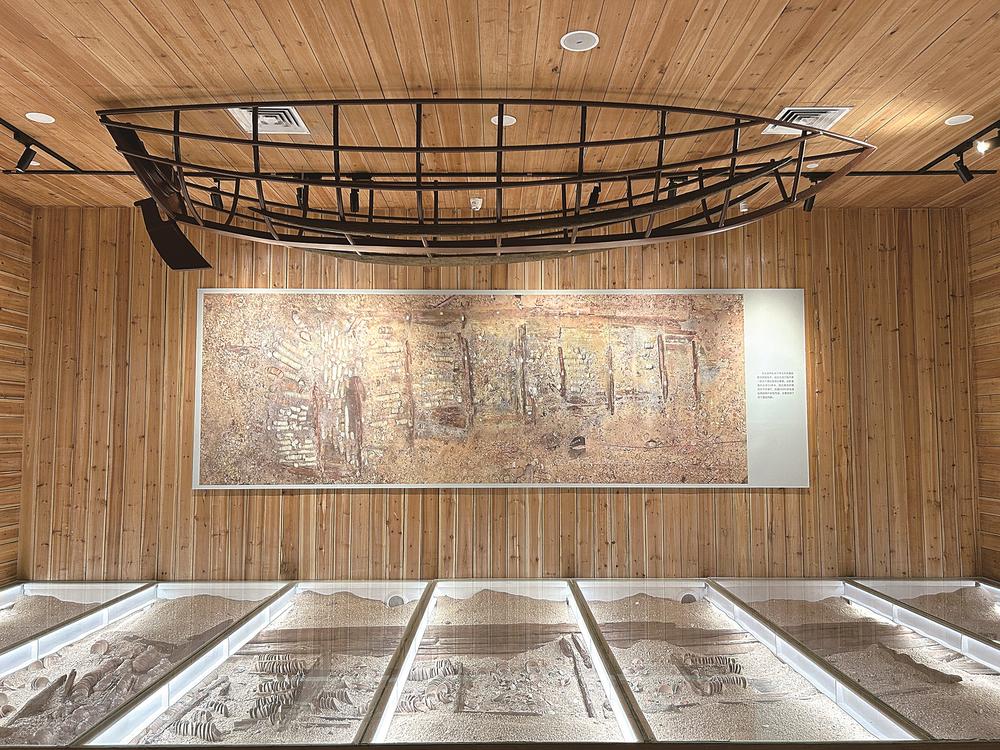 海丝厅中的圣杯屿沉船水下遗址沙盘,等比例复刻沉船遗址的全貌,照片上方悬挂的是舭龙骨模型。