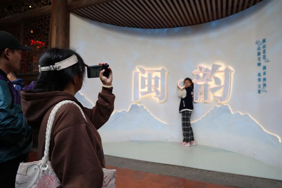参观完精美的展览,游客还能充分感受数字技术带来的新奇体验。会“讲故事”的屏风、巨幅《山海韵》光影浮雕画卷、传授“本地话”的方言打卡区等,在春节期间迅速成为游客喜爱的“网红”打卡点,让观众在欣赏文物的同时,进一步了解福建的民俗文化与自然风光。