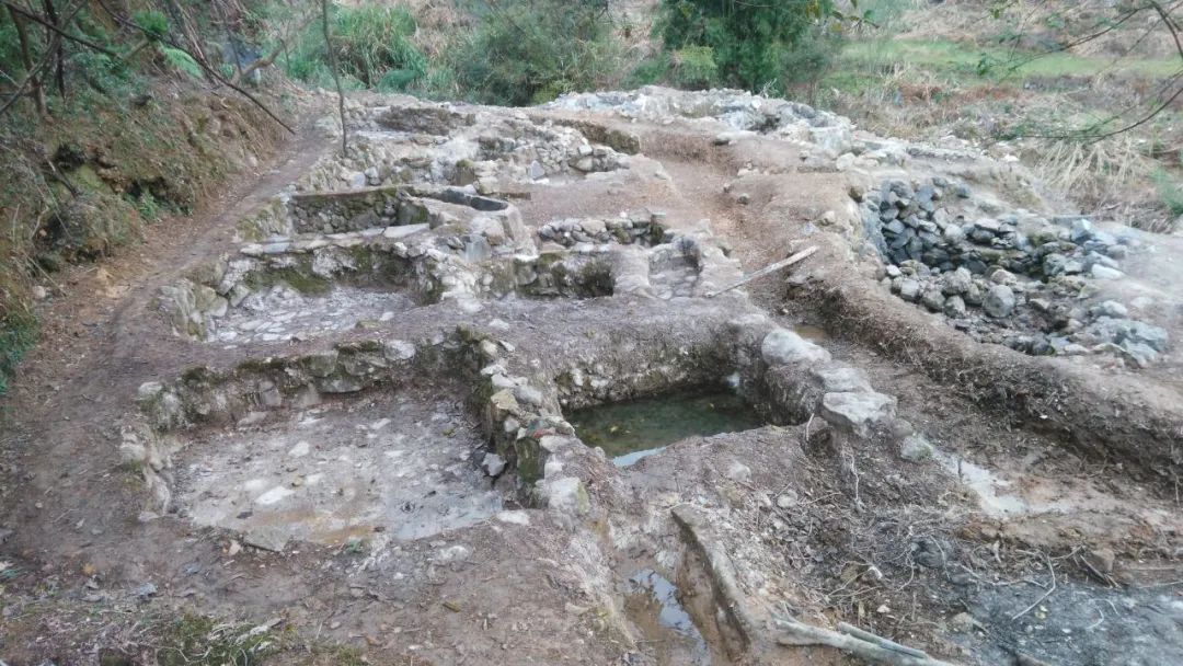 作坊遗迹位于窑炉的西北约100米,主要为瓷土粉碎、淘洗相关遗迹,从明清时期一直沿用到近现代,面积约1500平方米,大部分遗迹露出地表,发掘期间进行初步杂草清理,可见水车坑9个,臼坑18个,淘洗池等16个,石头垒成的引水渠长约80米(图16)。