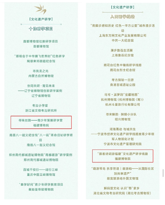 2025年11月25日至26日,由中国文物报社、河南省文物局、中国文化遗产传播中心、中华文明展示传播联盟主办,河南省文物考古研究院承办的“第二届文化遗产研学十佳项目和十佳线路宣传展示活动”终选会在郑州举行。福建博物院报送的“寻味丝路——青少年策展研学营”荣获十佳研学项目,“跟着诗词游福建”文化遗产研学线路荣获入围研学线路。
