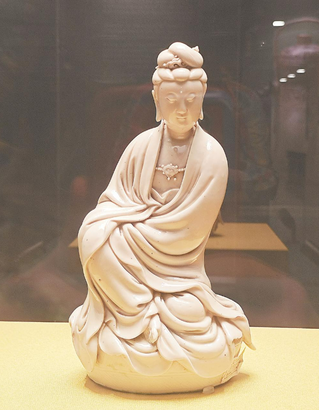 现场展出的何朝宗款德化窑白釉观音坐像。这件与福建相关的文物,是明代德化窑的经典作品。