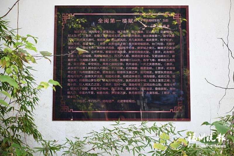 为了弥补这份缺憾,2018年,李厚威在《福州晚报》刊发文章提出设想:挑选近代最佳“鼓楼赋”刻碑立传,以文字复原历史记忆。经过多方寻访,林则徐的“两姨表亲”表哥——清代进士曾晖春创作的《全闽第一楼赋》进入公众视野。“这是已知福州鼓楼的唯一之赋,也是最佳之作。”李厚威介绍,该赋以“千年楼阁峙东瓯”为韵,将鼓楼的地理方位、历史沿革、楼内外近景远景尽数囊括,“‘三千层城堞’‘百万户人烟’这样的句子,若非亲临其境,绝难写出。”