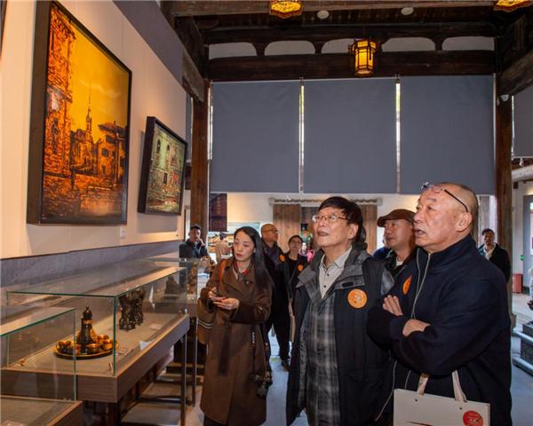 展览以“砂漏”为题,寓意时间流变与艺术永恒的思辨,通过“根脉的守望”“文明的对话”“心域的远游”“漆境无界”“数智互动”“创意造物”六大板块,立体呈现陈立德先生的艺术体系。这种“古建+艺术”的展陈模式,不仅为观众打造了沉浸式的观展体验,更让漆画这一传统艺术形式与古建文化碰撞出独特火花,凸显了博物馆在展陈策划上的匠心与创新。