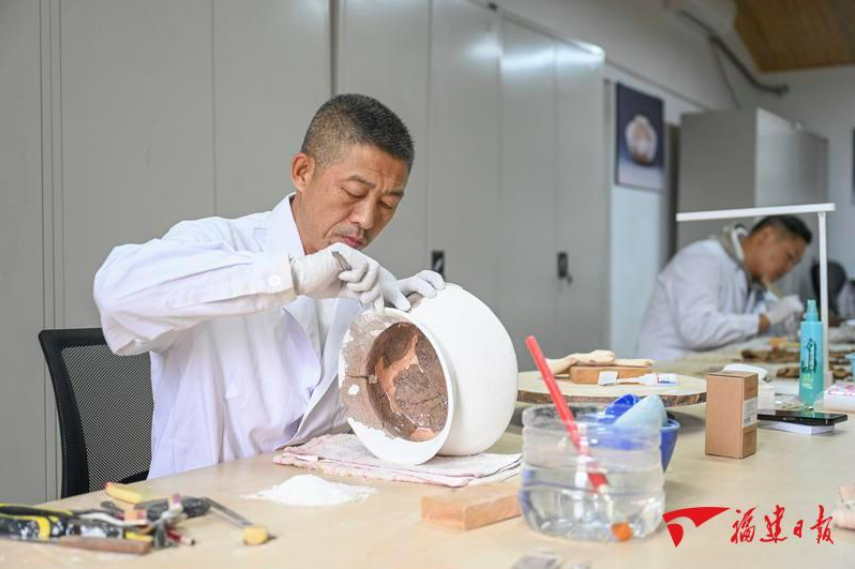 在平潭国际南岛语族考古研究基地的修复室内,专家在修复挖掘出土的陶器。通讯员 林君斌 摄