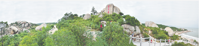 距此不远处,又有一块巨石,为《题捍海三雄镇(谓南之悬钟、北之烽火、南澳之新镇戍也)》,诗有两首,其一写道:“两关当地险,一胜自天成。此日收全概,千年享太平。”其二写道:“千年雄镇一时开,收拾风波入座(委+风)。罗罟结成包括尽,鲸鲵安得逐潮来。”