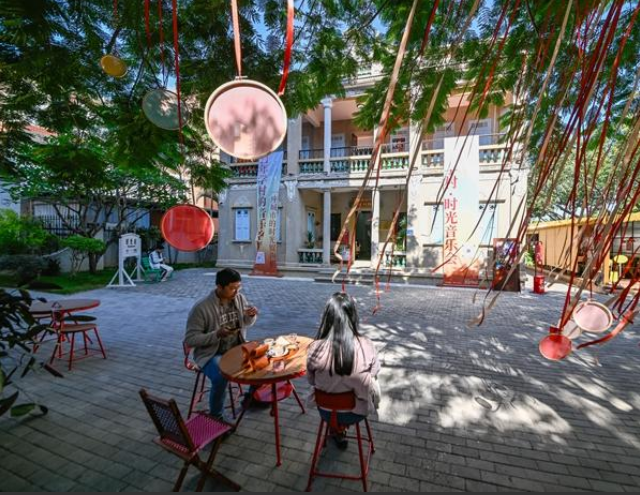在网红咖啡厅“时光花园”里,游客慢饮细品。