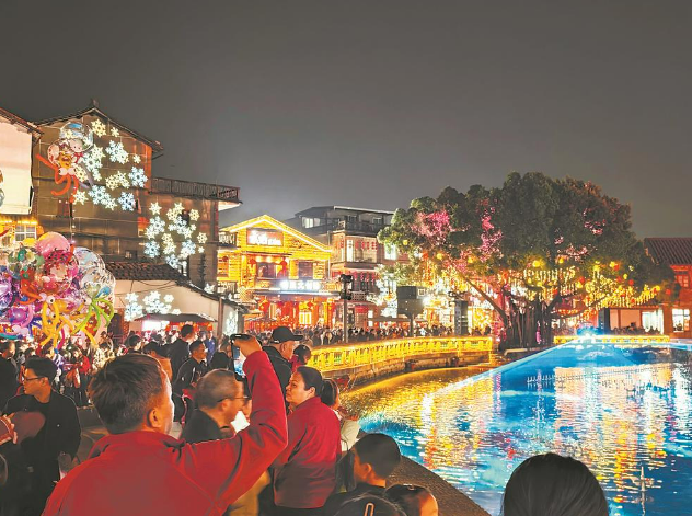 福船静卧,喷泉起舞,光影在红砖骑楼上流转……春节期间,莆田市涵江区萝苜田历史文化街区灯火璀璨,人流如织。水心河两岸人头攒动,璀璨灯火勾勒出古厝轮廓,音乐喷泉随律动起伏,水幕光影投射在“兴涵号”福船帆面,演绎着水韵涵江、民俗风情与城市新貌。