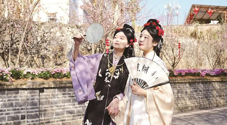 游客在梅林古镇赏花