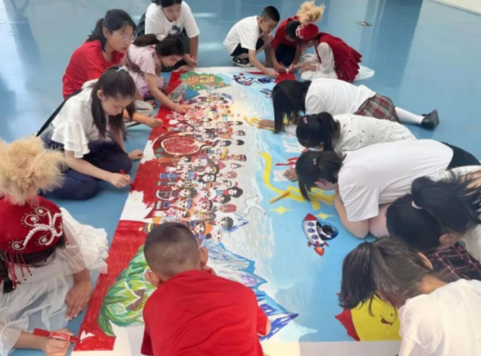 由中国民族博物馆发起的“童心共筑中国梦·儿童绘画作品展览及交流项目”,旨在以艺术为纽带铸牢中华民族共同体意识,促进各族青少年广泛交往、全面交流、深度交融。图为2023年8月,来京交流的儿童共同创作“童心共筑中国梦”大型作品。受访者供图
