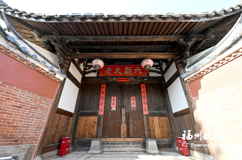 林春泽故居大门上挂着“六朝大老”匾额。