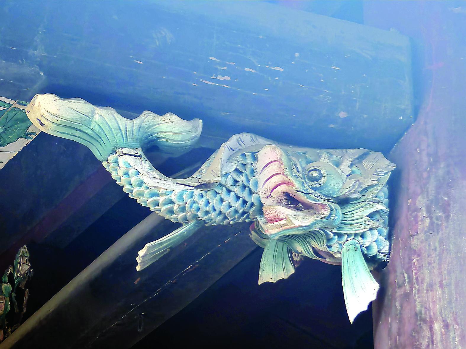 百忍堂门楼采用重檐歇山顶四柱三间三楼跌落牌坊式设计,斗拱飞檐、砖雕彩绘兼具闽北民居与官式建筑特色。梁枋间的“五斗三升”木雕构件,搭配祥云、卷草纹样,既作装饰,更象征家族兴旺稳固。房梁下的螭吻彩绘木雕,既能稳固结构,又被民间视为镇邪避火神兽,承载着族人的平安祈愿。