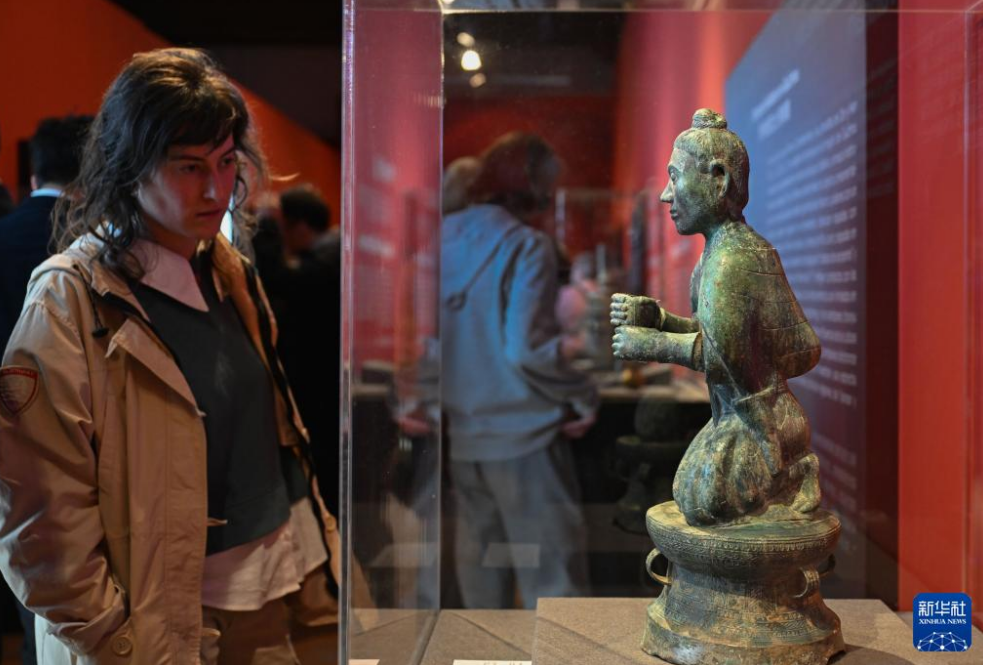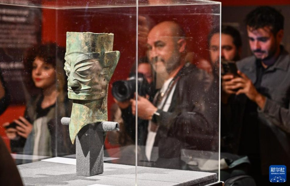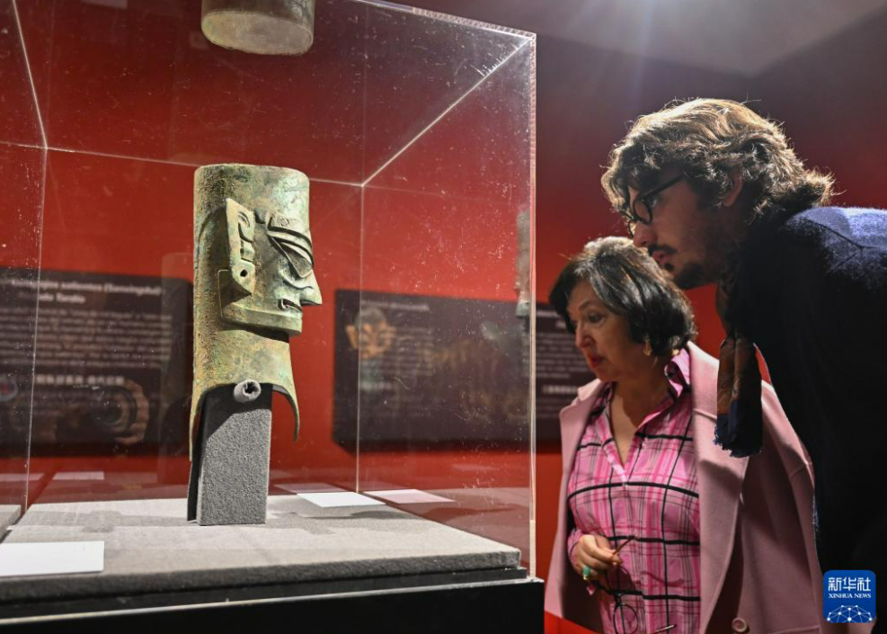 展厅内,来自三星堆遗址的代表性文物——青铜人头像立于序厅中央,吸引中西嘉宾和观众驻足观赏。参观者由此依次步入展览的3个单元,近距离欣赏铜人形器、执伞男铜俑、饰虎铜釜等精美青铜文物,了解中国西南地区不同区域文明交流互动、融合发展的历史进程。