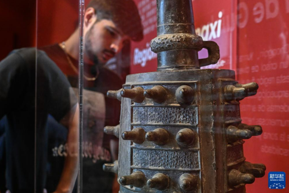 3月17日,在西班牙瓜达拉哈拉博物馆,一名男子参观中国西南地区青铜文明展上来自贵州的展品铜甬钟。新华社记者 程敏 摄