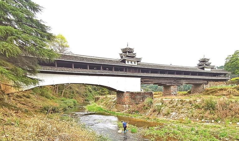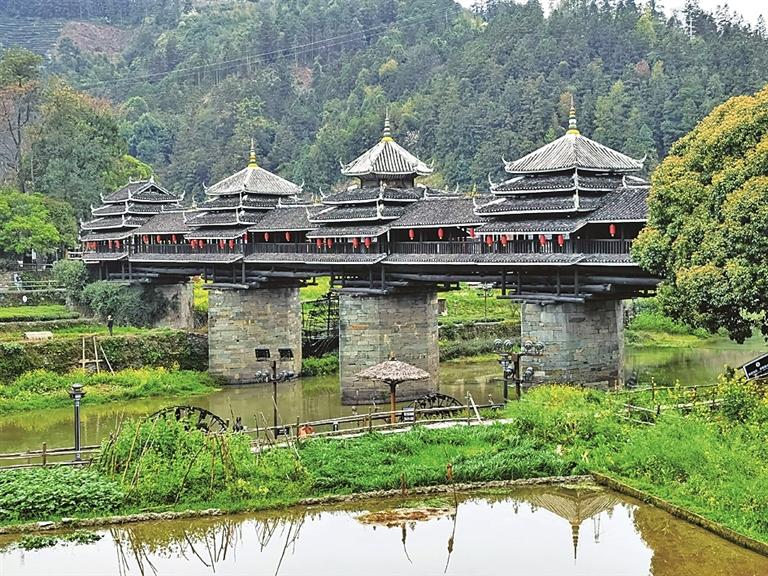就在这如画的景致中,全国重点文物保护单位廻龙桥悄然现身。这座横跨碧波的古桥,两端和中间分别有一座重檐六角攒尖顶的亭阁,顶上是葫芦宝瓶,承载着当地人对风调雨顺、平安吉祥的期许。240余年来,廻龙桥始终屹立河上,为村民遮风挡雨;而当地村民也以世代相传的智慧,悉心守护这座古桥,为其“祛病延年”。通道侗族木构建筑营造技艺省级非物质文化遗产代表性传承人杨盛春说:“我们祖祖辈辈住在这里,保护廻龙桥是我们的责任。修桥的时候,你家出一根木头,他家出一根木头,没有木头的就出工。”他言语朴素,语气却坚定。