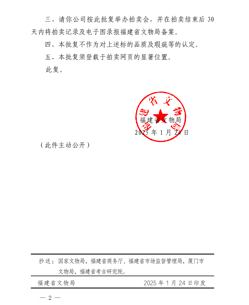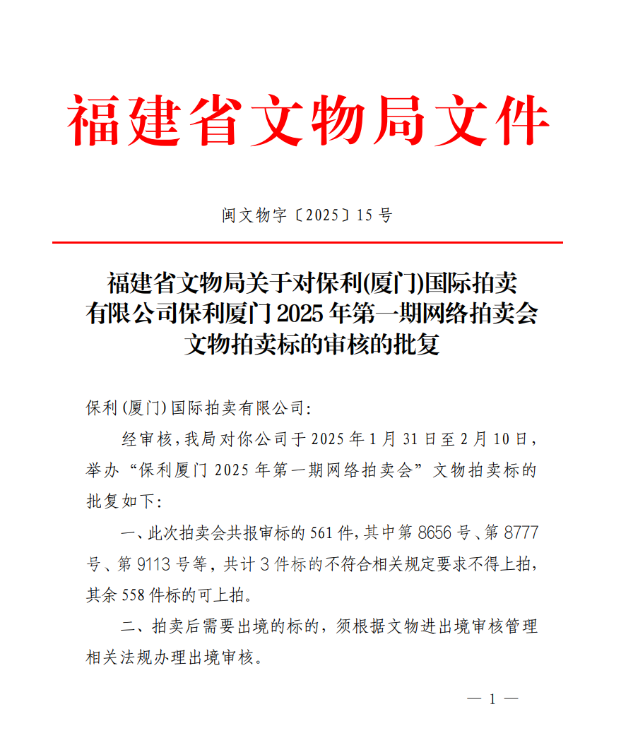 福建省文物局关于对保利(厦门)国际拍卖有限公司保利厦门2025年第一期网络直播拍卖会文物拍卖标的审核的批复