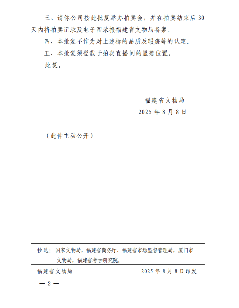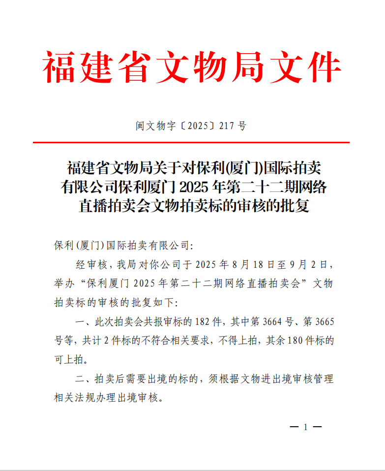福建省文物局关于对保利(厦门)国际拍卖有限公司保利厦门2025年第二十二期网络直播拍卖会文物拍卖标的审核的批复