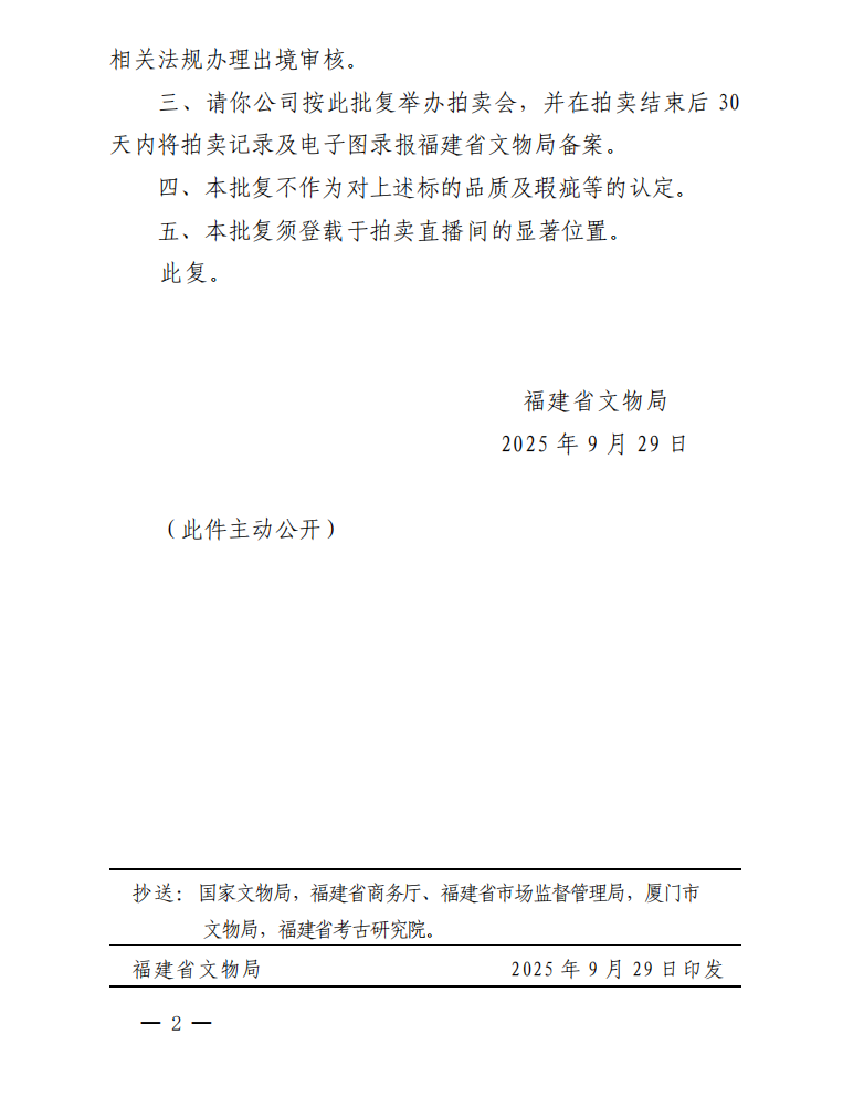 福建省文物局关于对保利(厦门)国际拍卖有限公司保利厦门2025年第二十九期网络直播拍卖会文物拍卖标的审核的批复