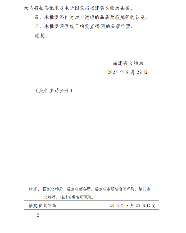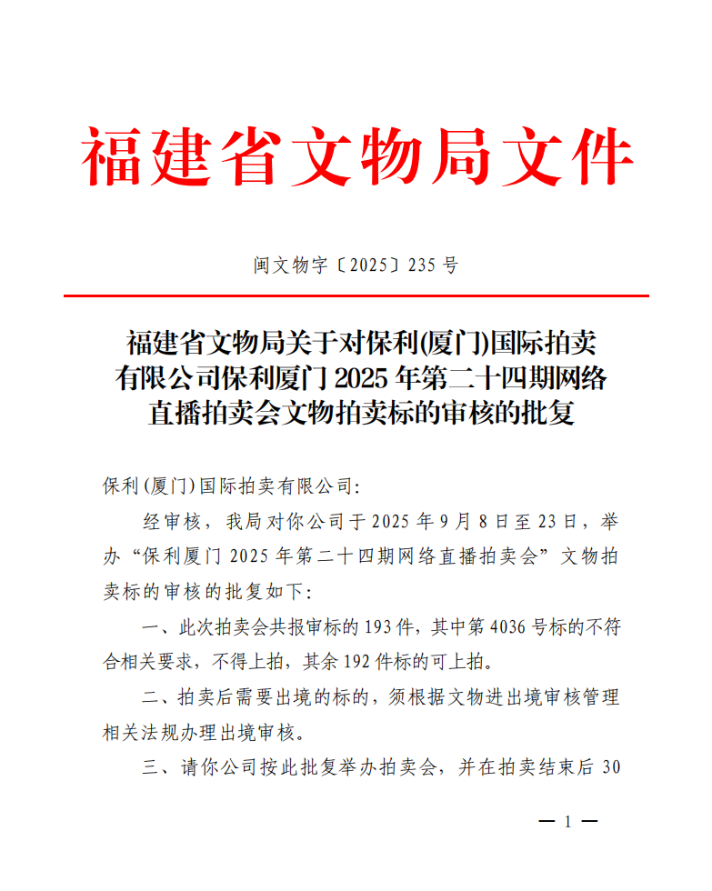 福建省文物局关于对保利(厦门)国际拍卖有限公司保利厦门2025年第二十四期网络直播拍卖会文物拍卖标的审核的批复