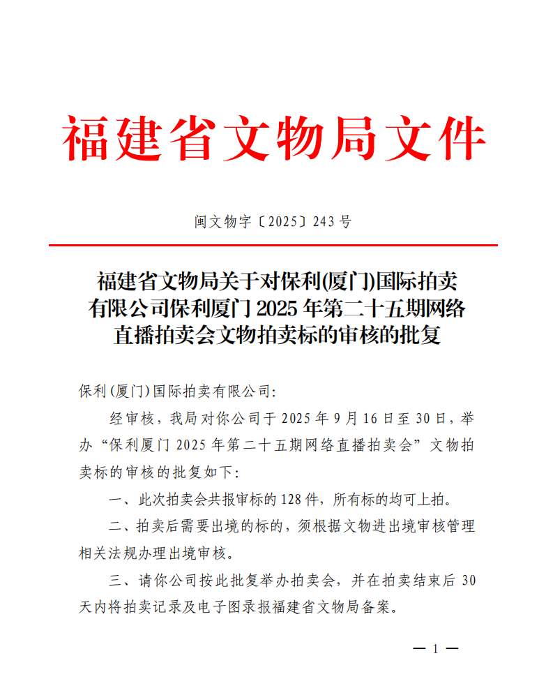 福建省文物局关于对保利(厦门)国际拍卖有限公司保利厦门2025年第二十五期网络直播拍卖会文物拍卖标的审核的批复