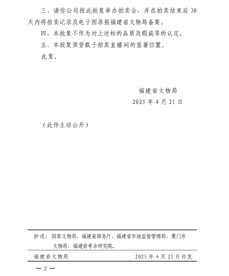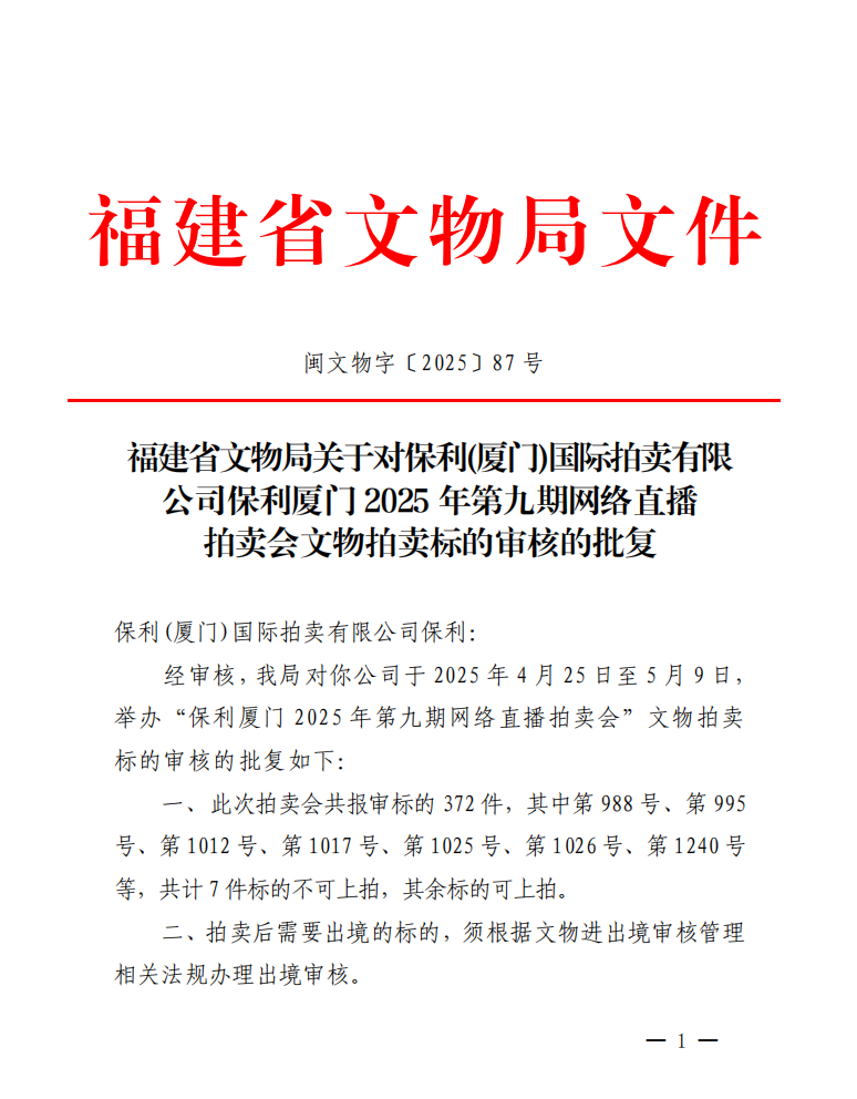 福建省文物局关于对保利(厦门)国际拍卖有限公司保利厦门2025年第九期网络直播拍卖会文物拍卖标的审核的批复
