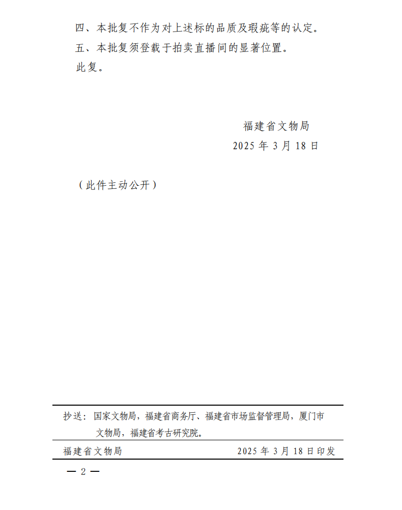 福建省文物局关于对保利(厦门)国际拍卖有限公司保利厦门2025年第六期网络直播拍卖会文物拍卖标的审核的批复