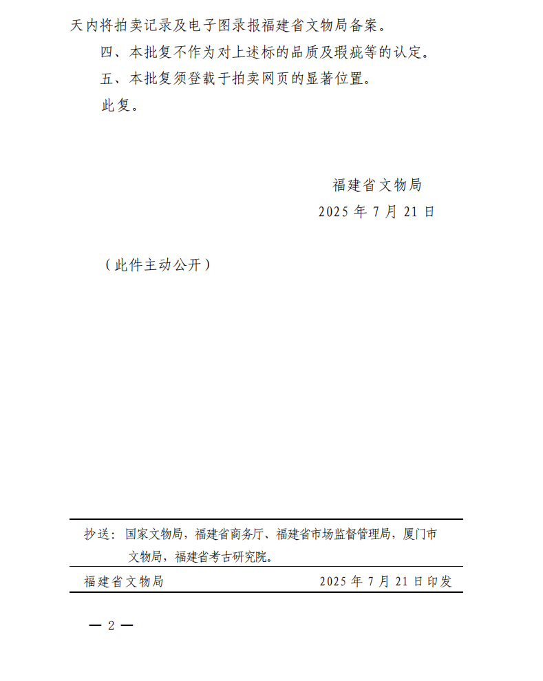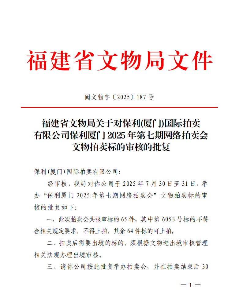 福建省文物局关于对保利(厦门)国际拍卖有限公司保利厦门2025年第七期网络拍卖会文物拍卖标的审核的批复