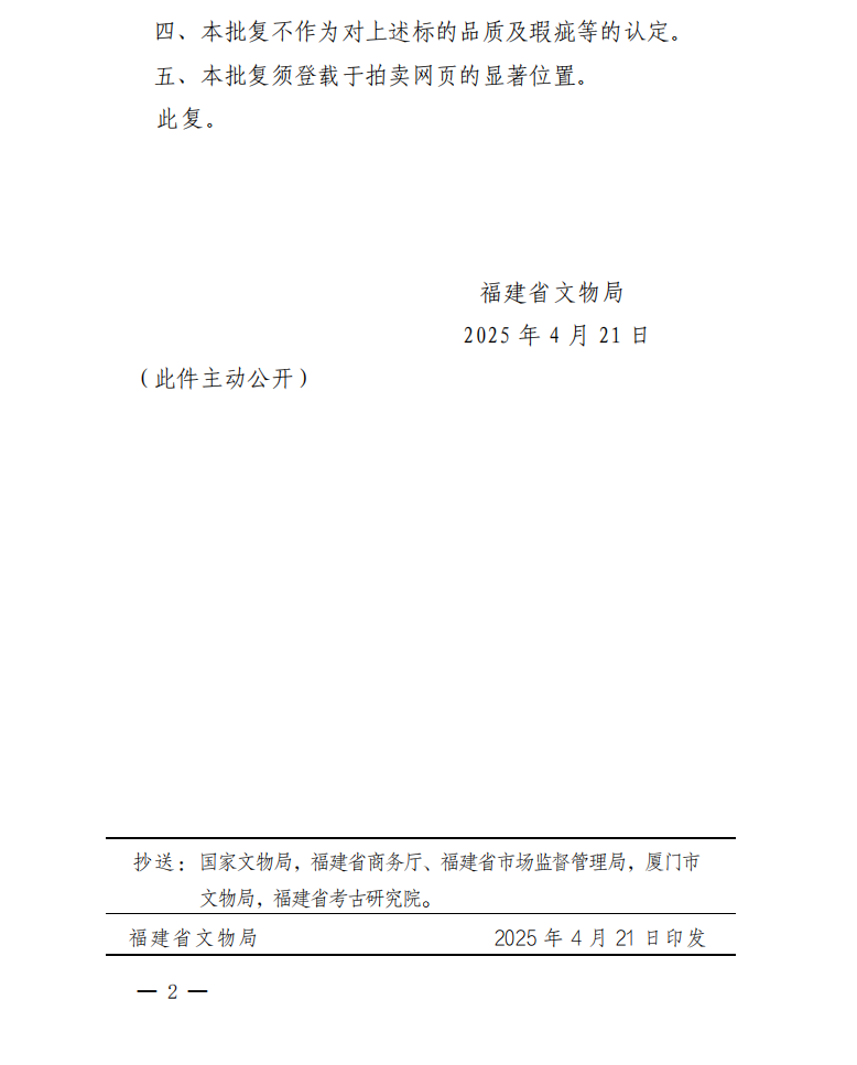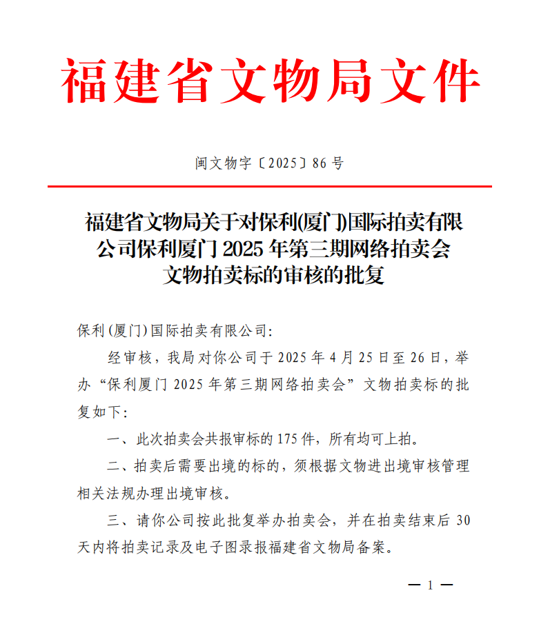 福建省文物局关于对保利(厦门)国际拍卖有限公司保利厦门2025年第三期网络拍卖会文物拍卖标的审核的批复