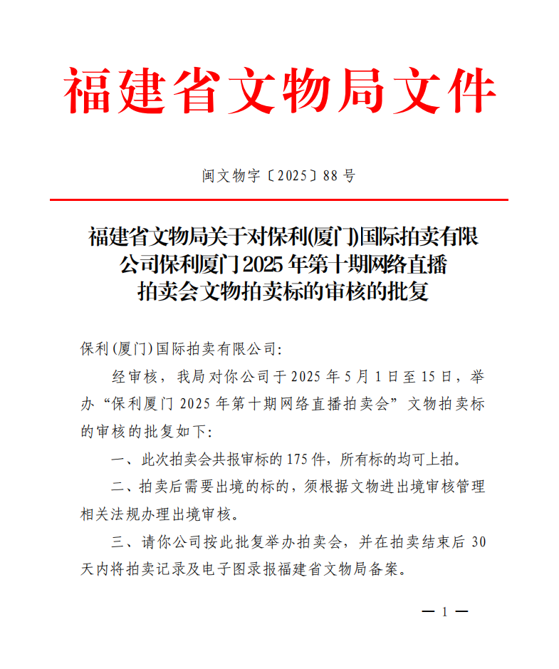 福建省文物局关于对保利(厦门)国际拍卖有限公司保利厦门2025年第十期网络直播 拍卖会文物拍卖标的审核的批复