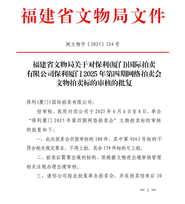 福建省文物局关于对保利(厦门)国际拍卖有限公司保利厦门2025年第四期网络拍卖会文物拍卖标的审核的批复