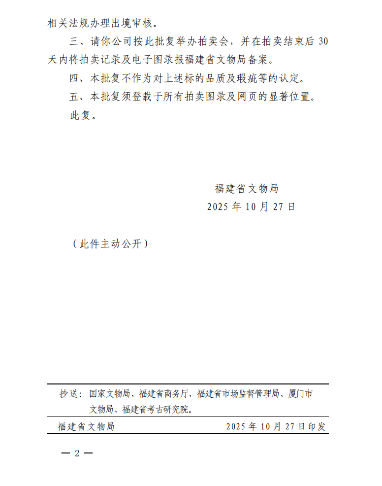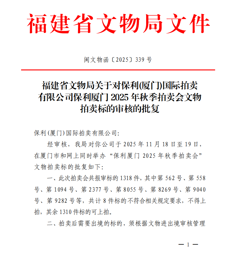 福建省文物局关于对保利(厦门)国际拍卖有限公司保利厦门2025年秋季拍卖会文物拍卖标的审核的批复
