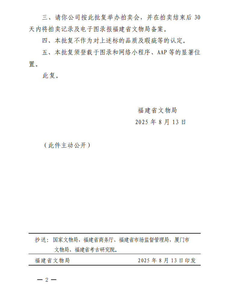 福建省文物局关于对保利(厦门)国际拍卖有限公司保利厦门2025年四季拍卖会第二期文物拍卖标的审核的批复
