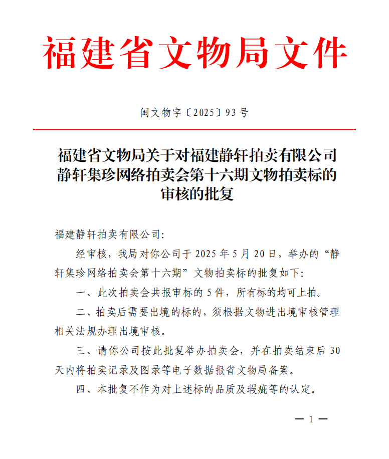 福建省文物局关于对福建静轩拍卖有限公司静轩集珍网络拍卖会第十六期文物拍卖标的审核的批复