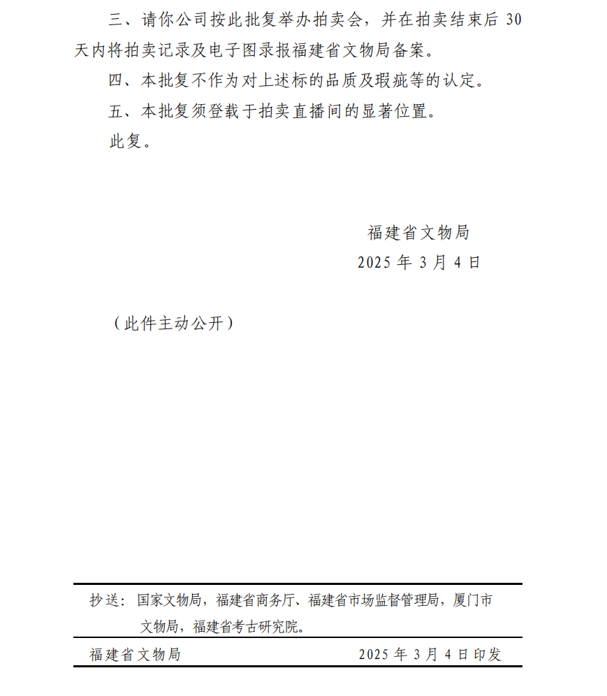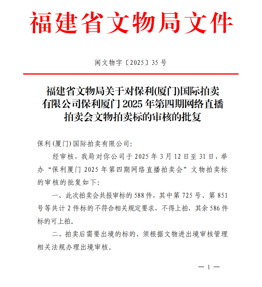 福建省文物局关于对保利(厦门)国际拍卖有限公司保利厦门2025年第四期网络直播拍卖会文物拍卖标的审核的批复