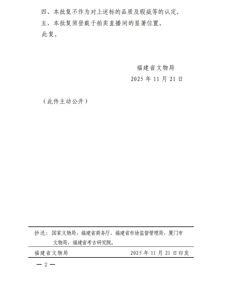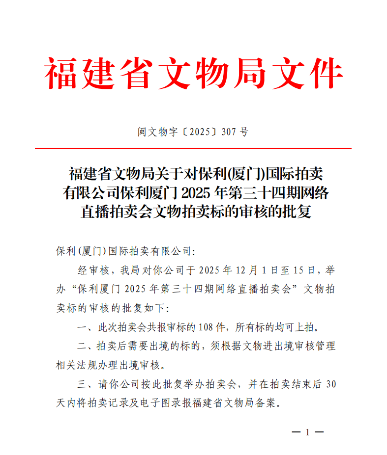 福建省文物局关于对保利(厦门)国际拍卖有限公司保利厦门2025年第三十四期网络直播拍卖会文物拍卖标的审核的批复