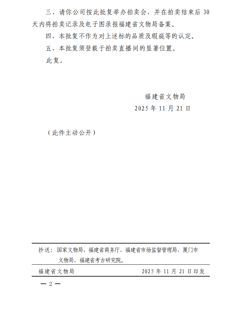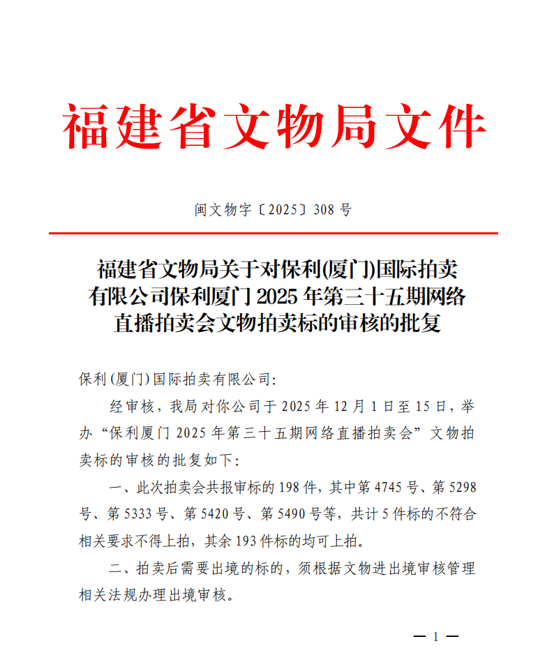 福建省文物局关于对保利(厦门)国际拍卖有限公司保利厦门2025年第三十五期网络直播拍卖会文物拍卖标的审核的批复