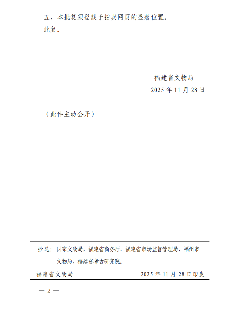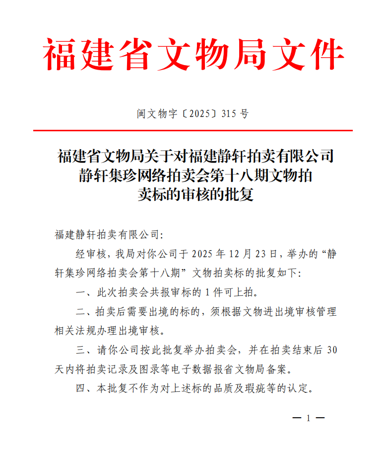 福建省文物局关于对福建静轩拍卖有限公司静轩集珍网络拍卖会第十八期文物拍卖标的审核的批复