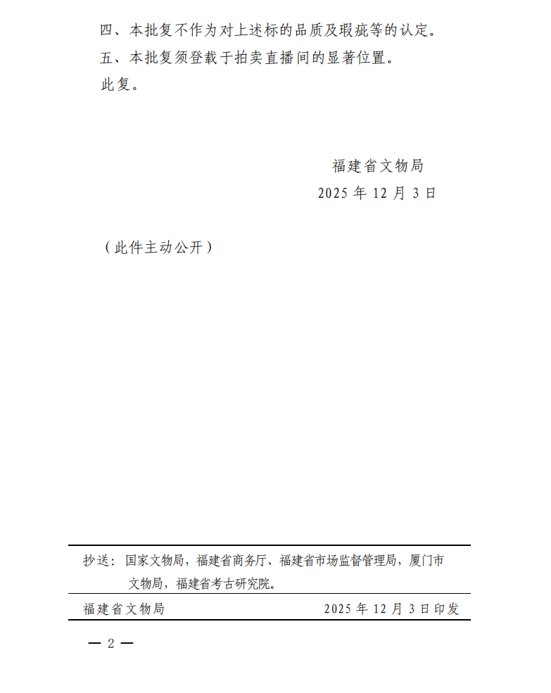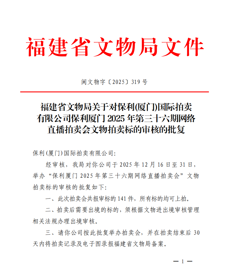 福建省文物局关于对保利(厦门)国际拍卖有限公司保利厦门2025年第三十六期网络直播拍卖会文物拍卖标的审核的批复
