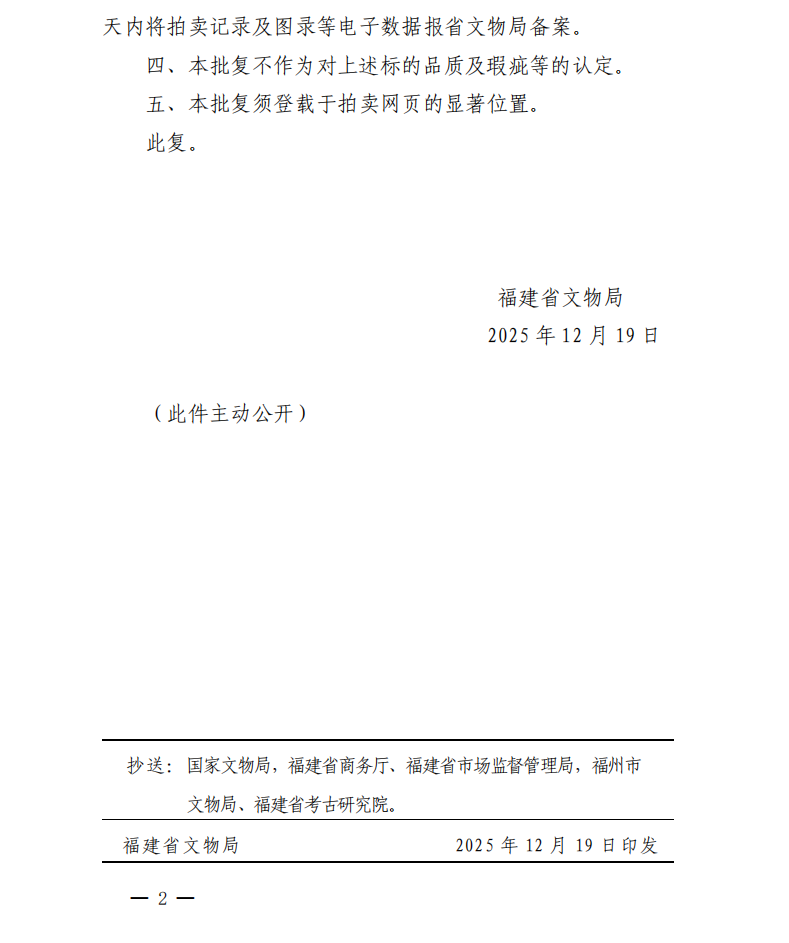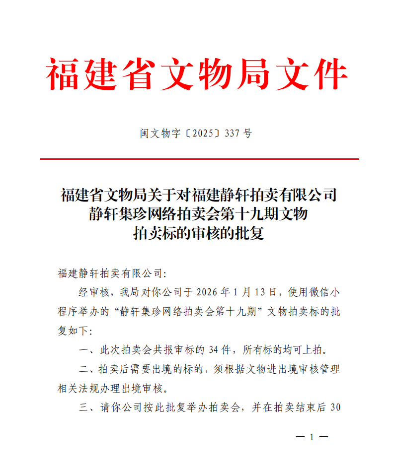 福建省文物局关于对福建静轩拍卖有限公司静轩集珍网络拍卖会第十九期文物拍卖标的审核的批复