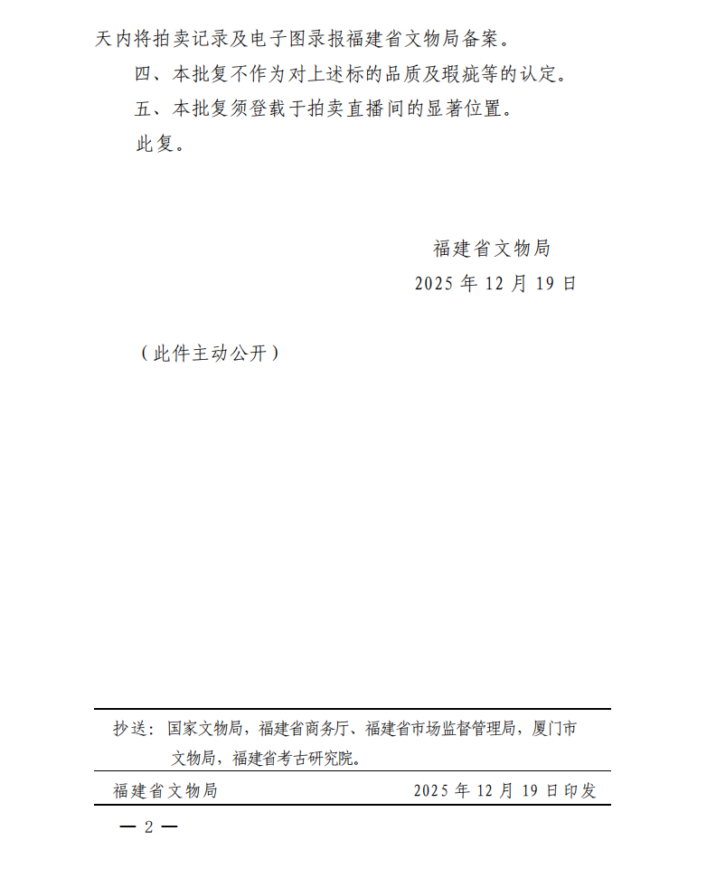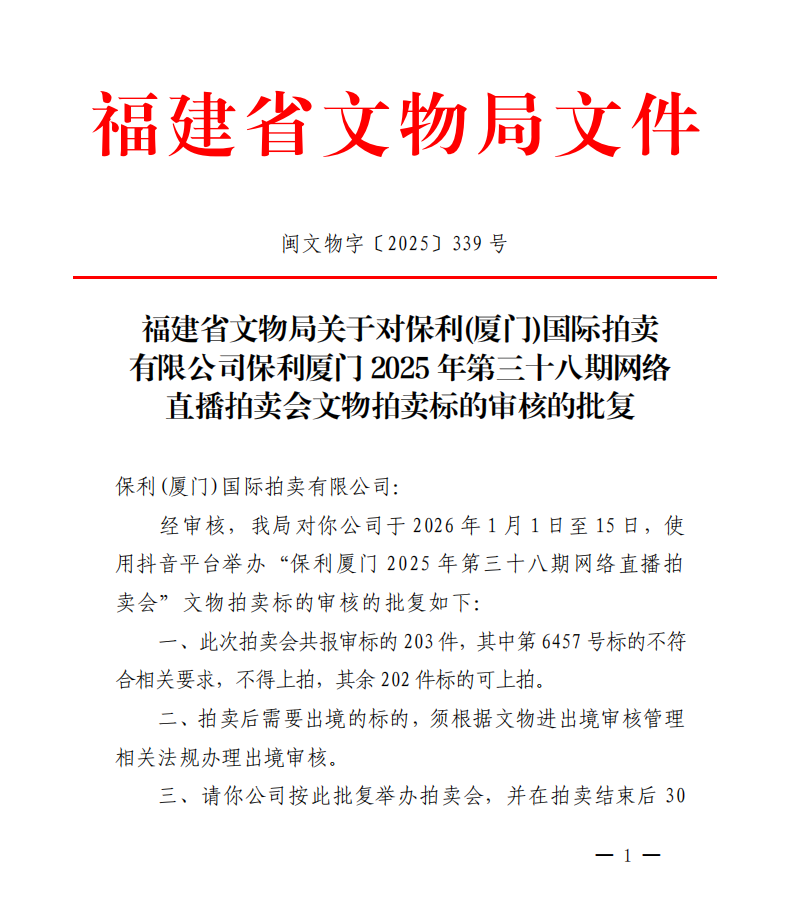福建省文物局关于对保利(厦门)国际拍卖有限公司保利厦门2025年第三十八期网络直播拍卖会文物拍卖标的审核的批复