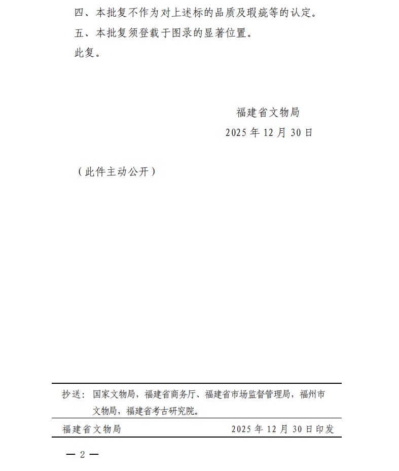 福建省文物局关于福建省居正拍卖行有限公司福建居正江南艺拍2026小程序网络限时拍文物拍卖标的审核的批复