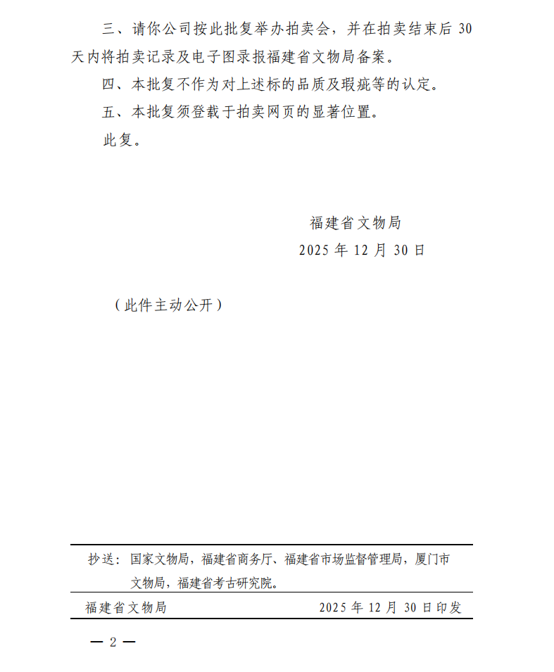 福建省文物局关于对保利(厦门)国际拍卖有限公司保利厦门2026年第一期网络拍卖会文物拍卖标的审核的批复