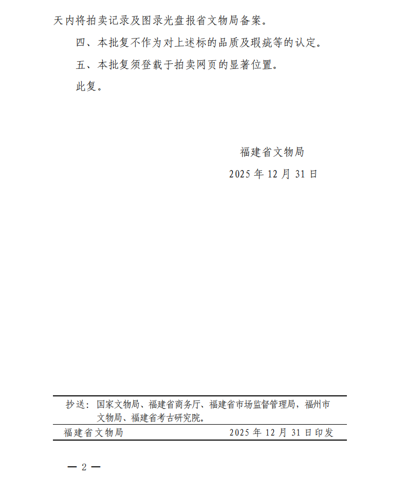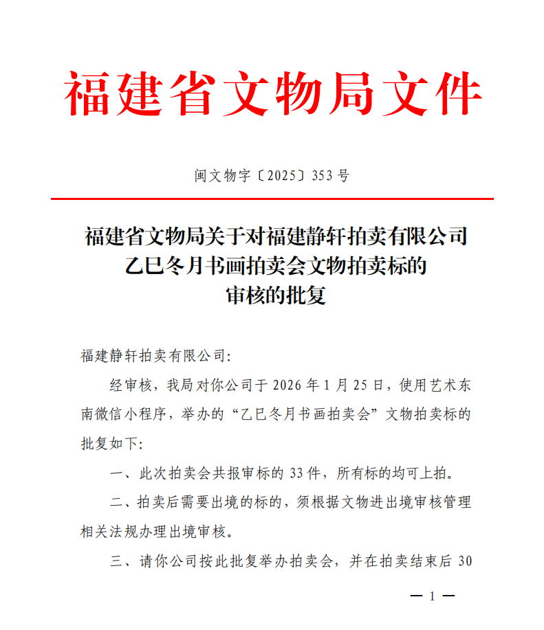 福建省文物局关于对福建静轩拍卖有限公司乙巳冬月书画拍卖会文物拍卖标的审核的批复